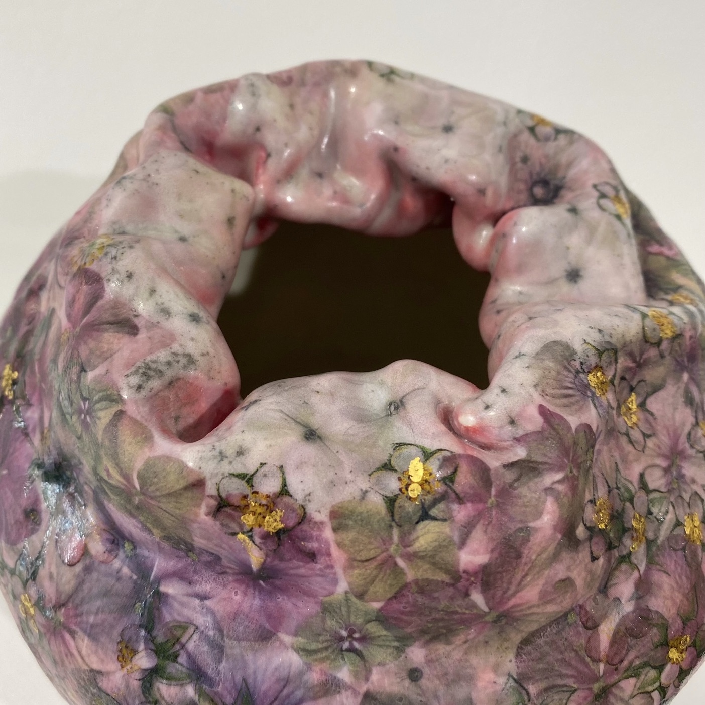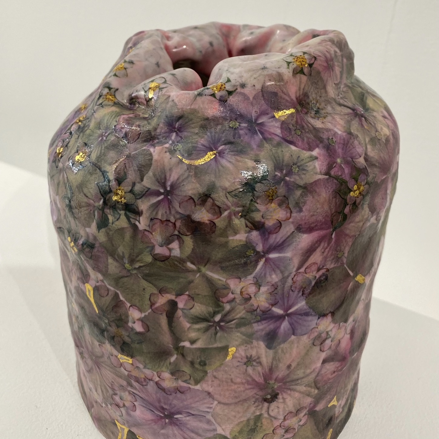 Porcelain vessel decorated with coloured slips, glaze, ceramic transfers and gold leaf.